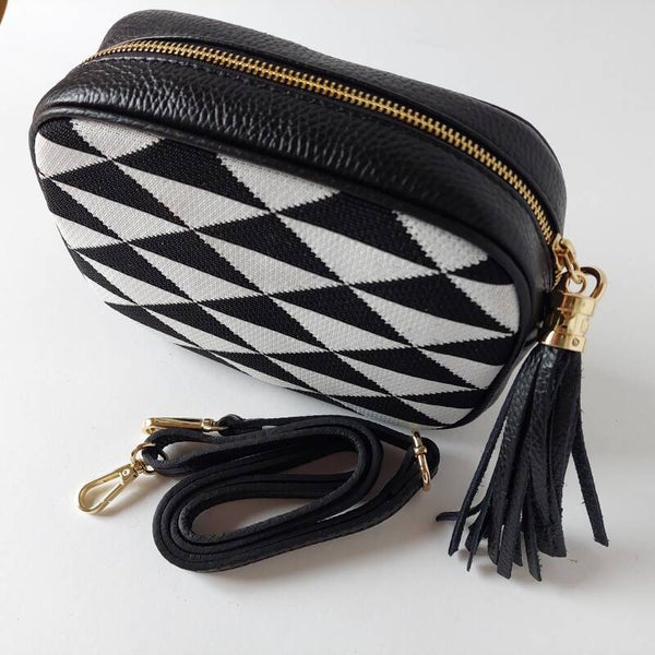 Opvallende crossbody tas in zwart-wit ruitmotief van hoogwaardig leer. Ruim van formaat, met een rits en een stijlvol leren kwastje. Perfect voor een moderne en trendy uitstraling!