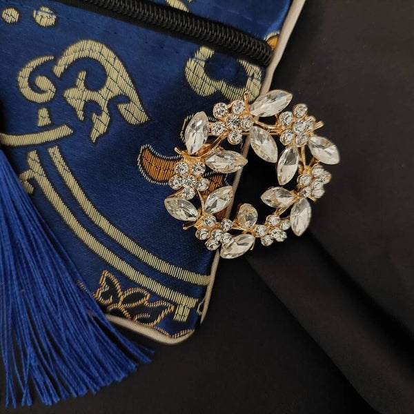 "Een verfijnde broche in de vorm van een krans, gedetailleerd met sierlijke blaadjes en delicate bloemknopjes. Versierd met sprankelende, diamantachtige steentjes voor een elegante en tijdloze uitstraling."