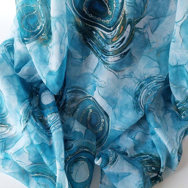 Blauwe sjaal - cirkel motief - subtiele goudgaren - lichte sjaal