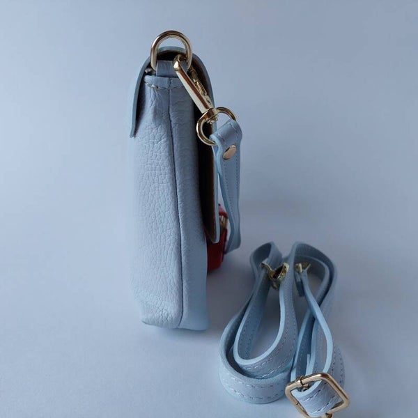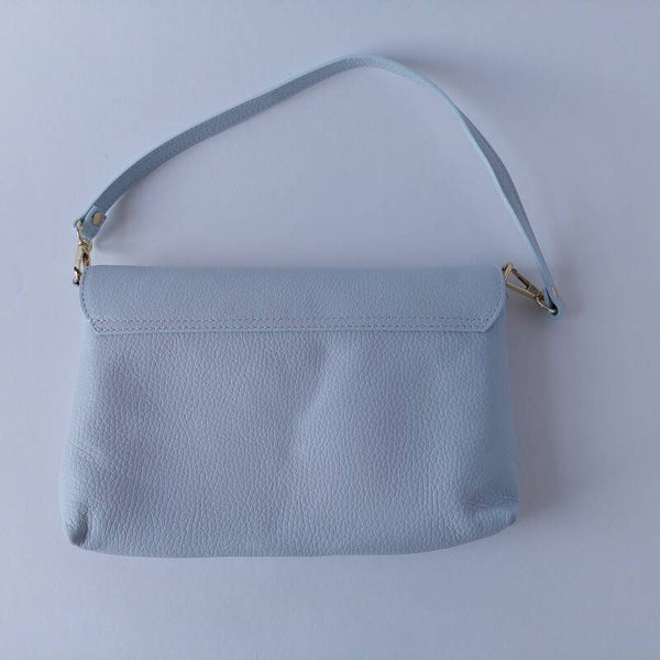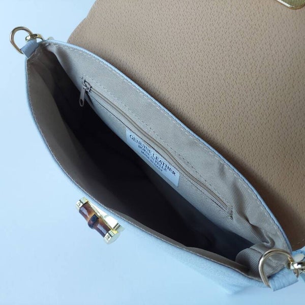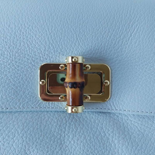 Crossbody - tas - licht blauw - pastel - echt leer - Italië - super kwaliteit - soepel - bamboe look draai sluiting - handtas - messing details - een tas voor jou