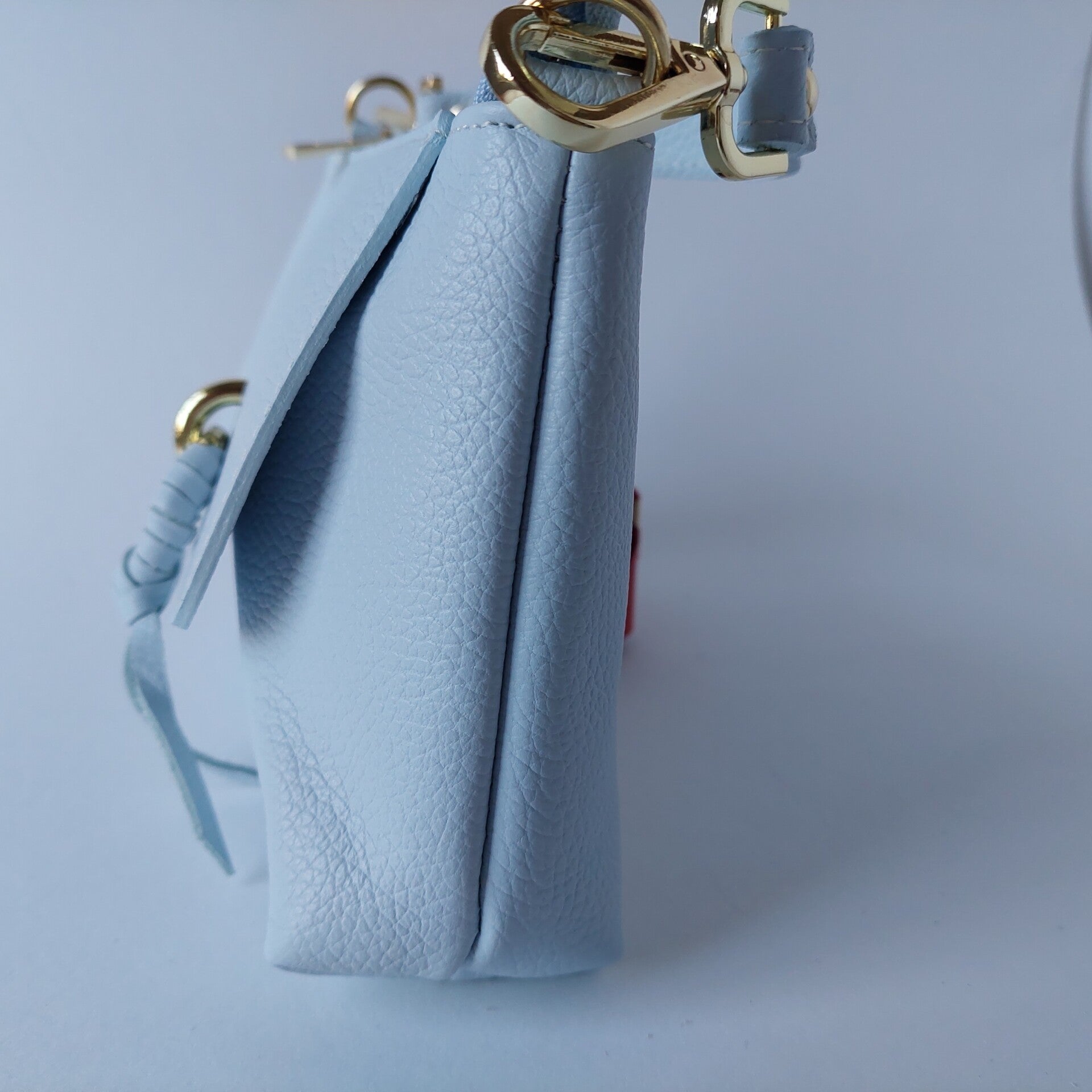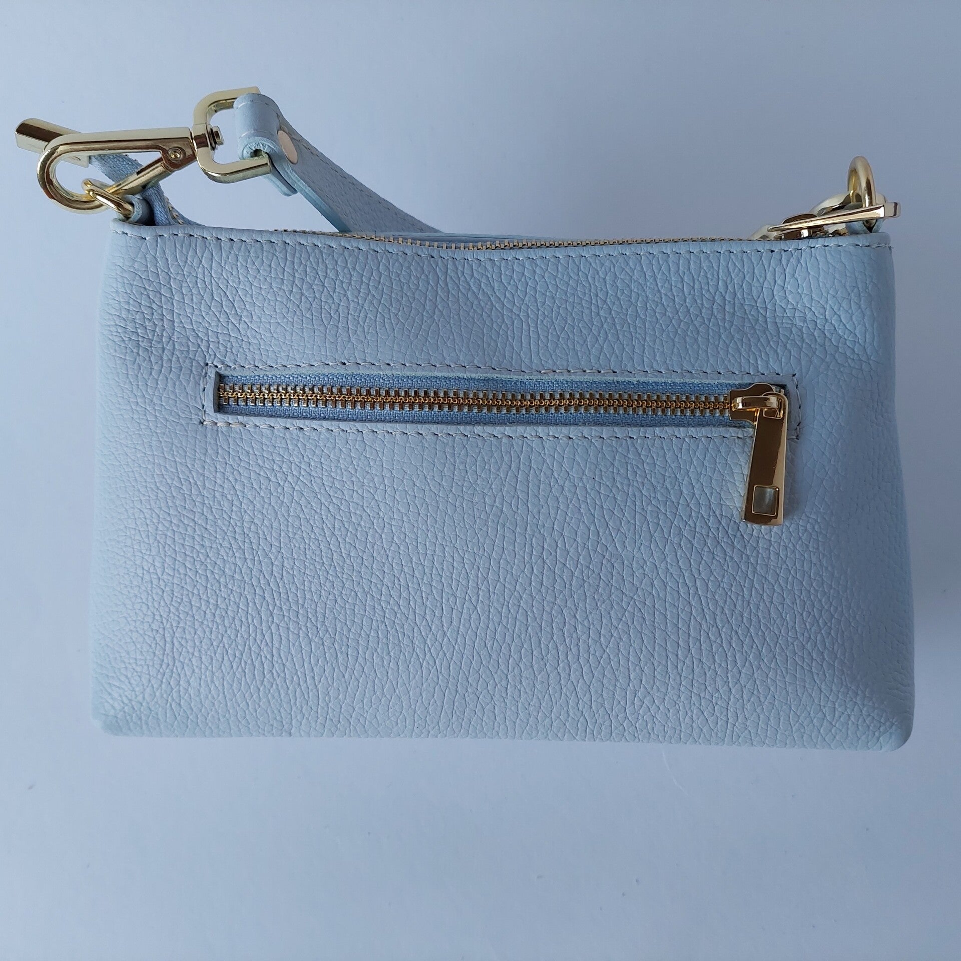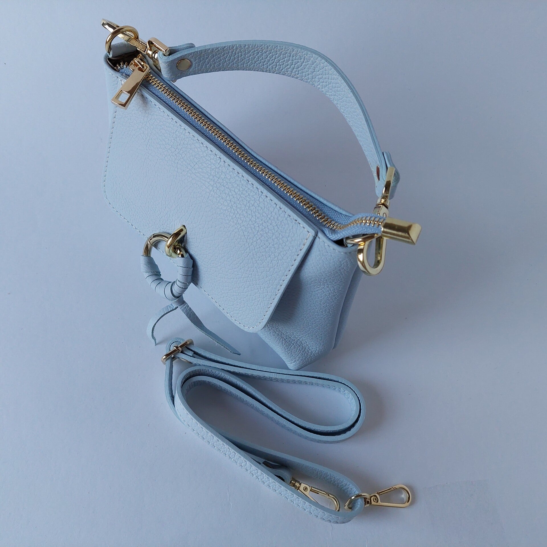 Deze trendy crossbody handtas in pastelblauw is dé must-have van dit seizoen. Handgemaakt in Italië van echt leer en afgewerkt met een stijlvolle messing sierring. Vlot, opvallend en hip – perfect voor een modieuze look!