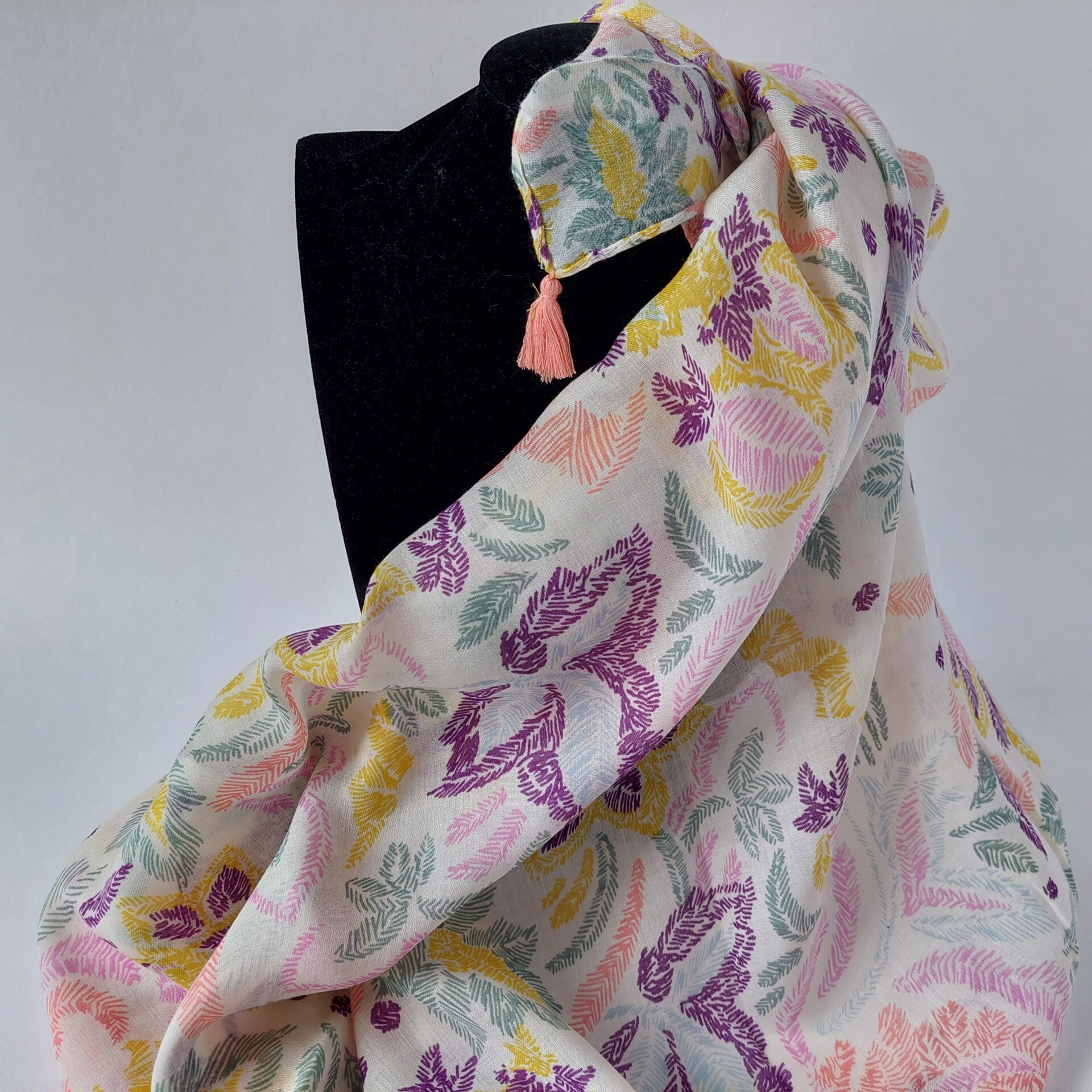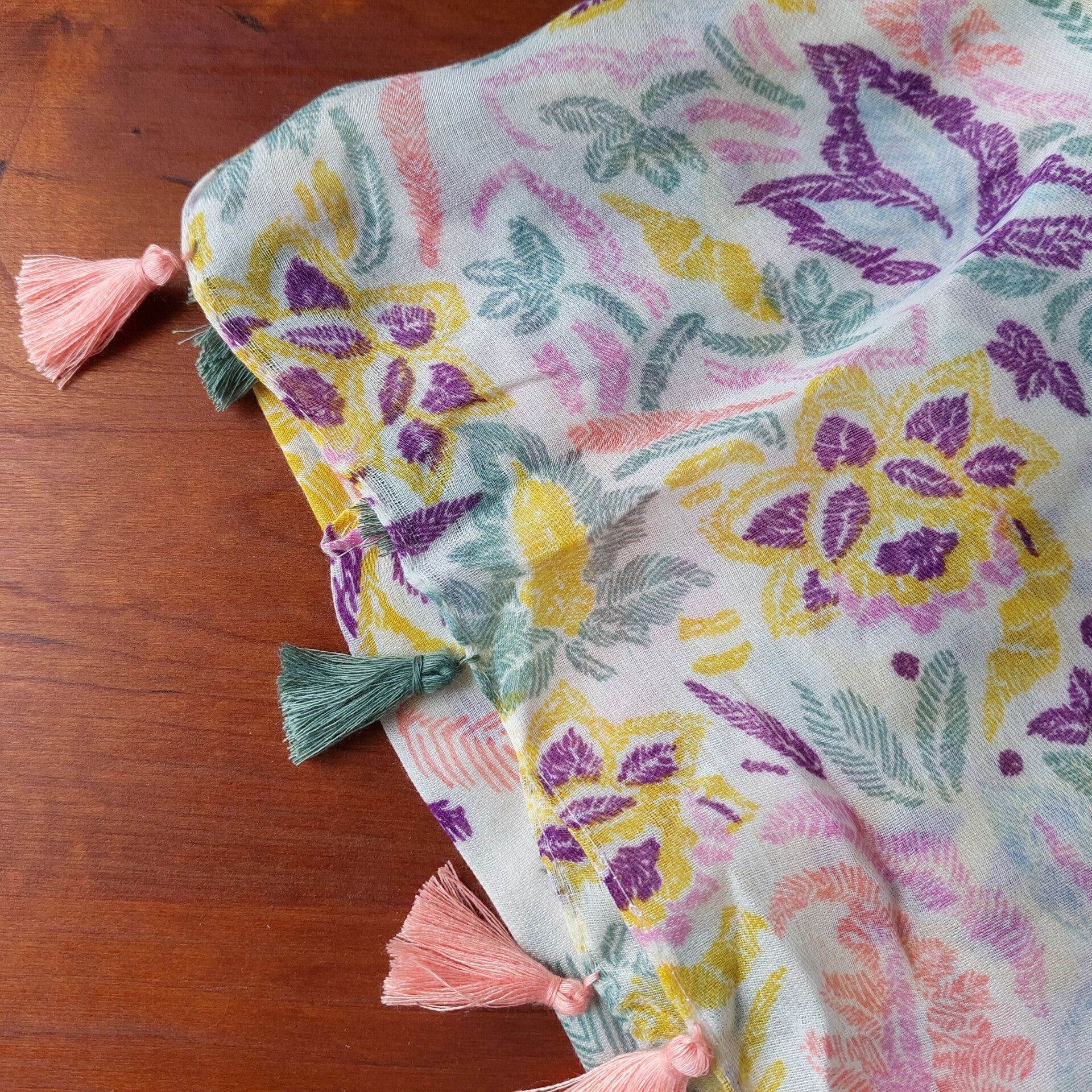 Vrolijke sjaal - lente/zomer - wit - diverse kleurtjes - kwastjes - fantasie motief - grootste collectie sjaals