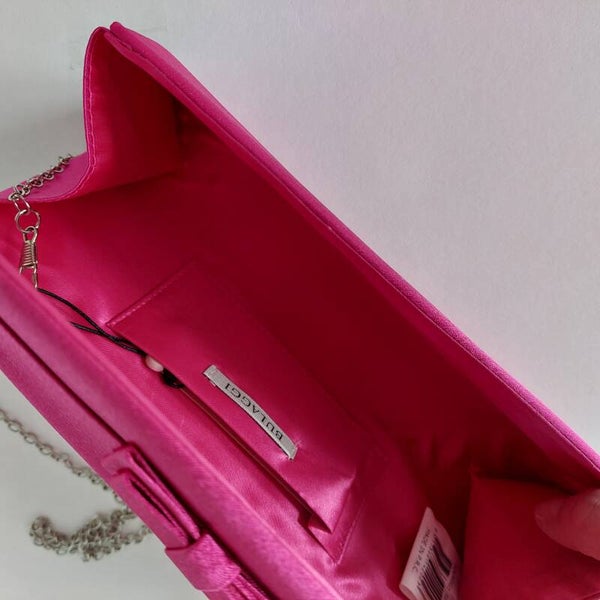 Voeg een vleugje elegantie toe aan je avondlook met deze exclusieve fuchsia clutch van satijn. Dit stijlvolle avondtasje met vlinderstrikje is een echte blikvanger op gala's, bruiloften, diners of andere feestelijke gelegenheden. Dankzij de afneembare schouderketting draag je het zowel als handtas als crossbody, helemaal afgestemd op jouw outfit.