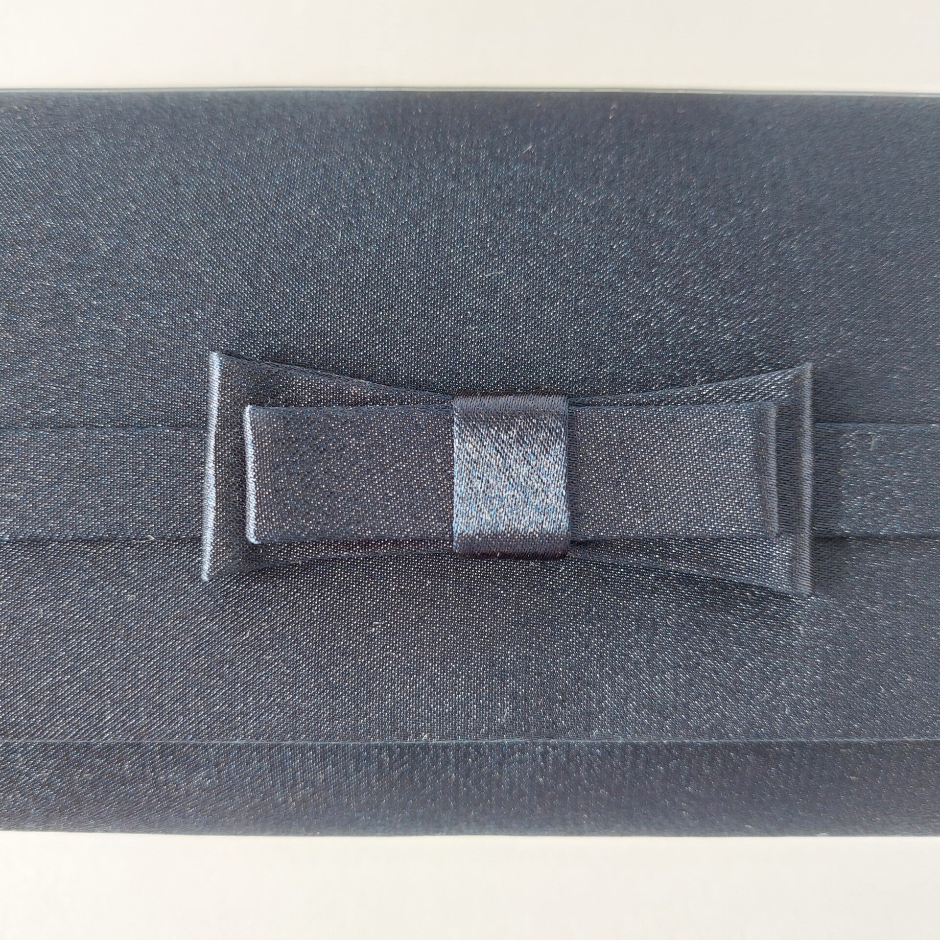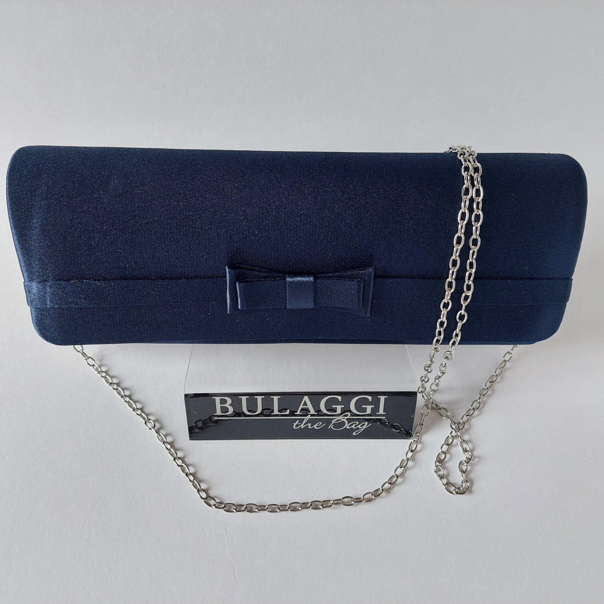 Maak jouw avondlook compleet met deze stijlvolle donkerblauwe clutch. Gemaakt van luxe glanzend satijn, met een verfijnd strikje als eyecatcher. Draag ‘m als handtas of schoudertas dankzij de afneembare zilverkleurige ketting. De tas is compact, maar ruim genoeg voor je essentials: telefoon, lipstick en sleutels.