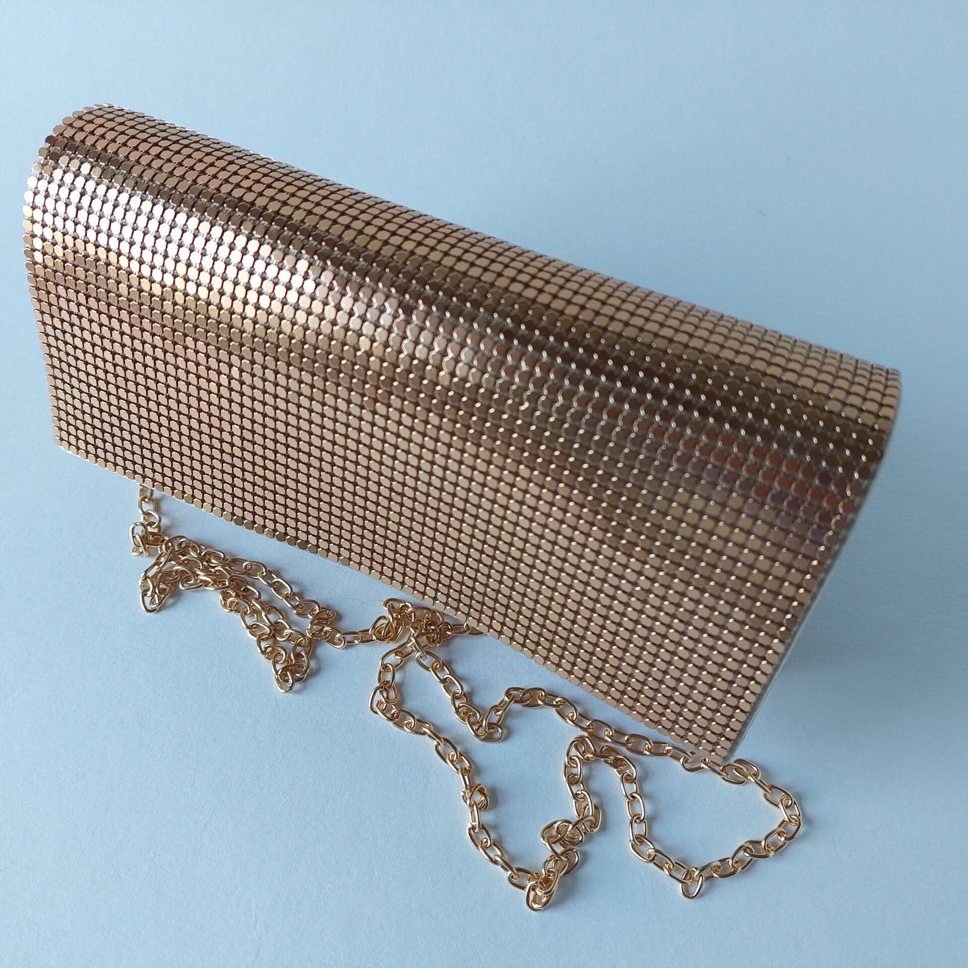 Gouden Bulaggi clutch met lovertjes – handgemaakt, messing ketting, beige binnen voering