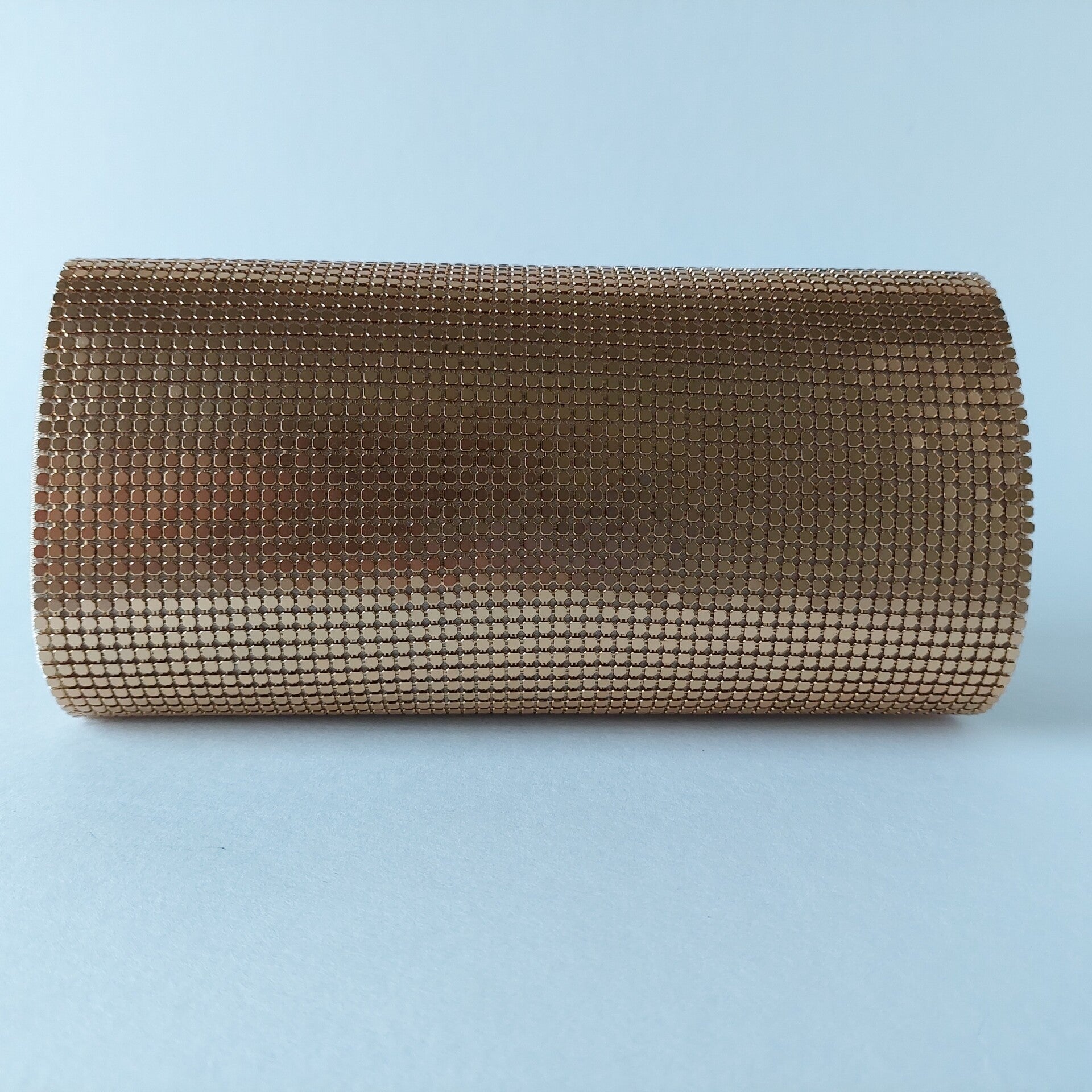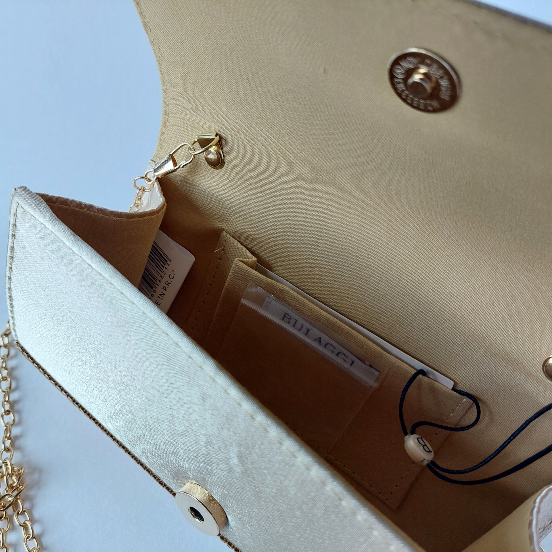 handgemaakte gouden Bulaggi clutch met kleine vierkante lovertjes, messing ketting en één hoofdvak met klein binnenvak, afgewerkt met beige stof voor een elegante en luxe uitstraling.