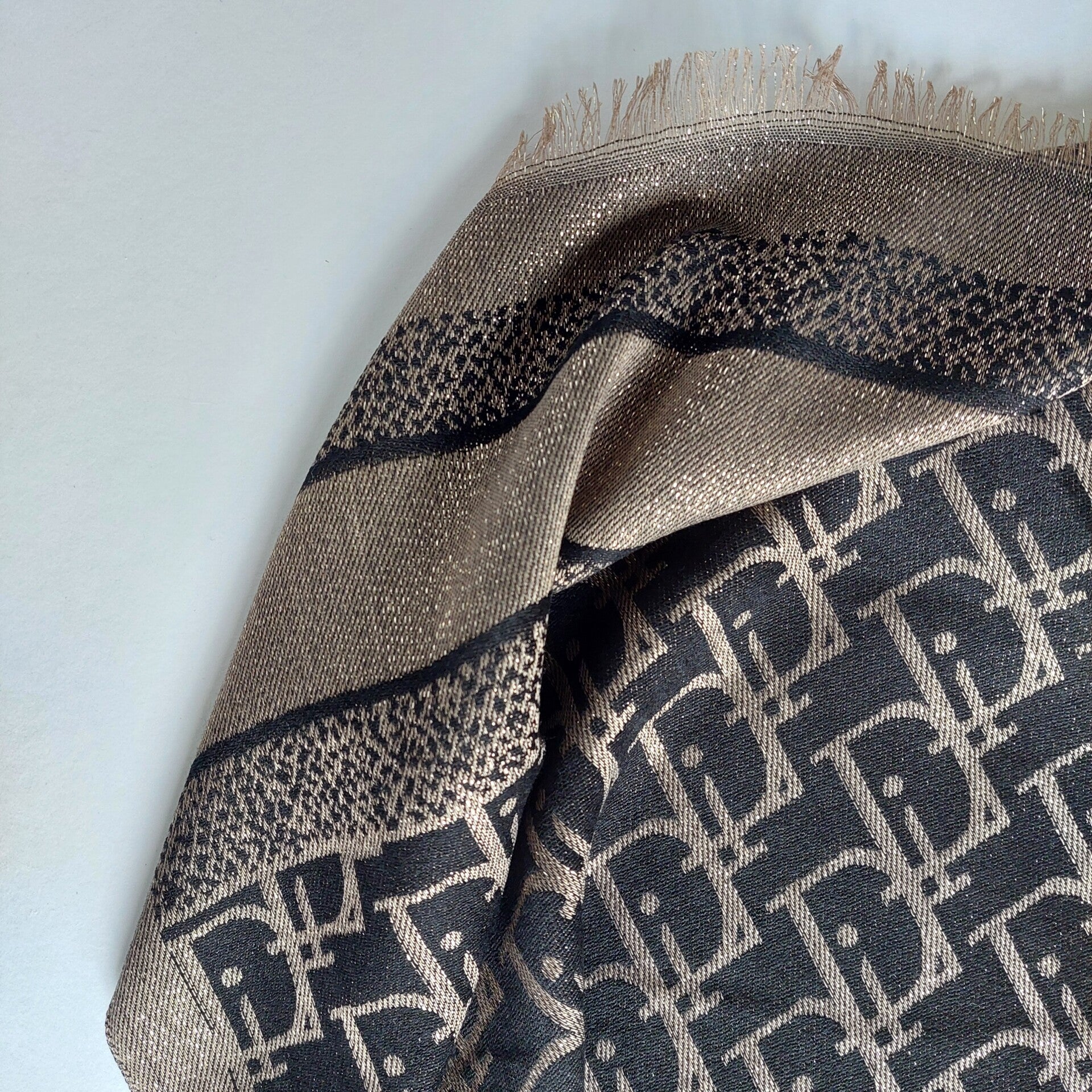 Luxe dames winter sjaal in zwart met subtiel gouddraad en stijlvol letter motief. Deze viscose sjaal van dunnere stof is licht, goed drapeerbaar en afgewerkt met kleine franjes. Perfect om je outfit een elegante en chique uitstraling te geven. Ontdek de grootste collectie luxe sjaals uit eigen voorraad.