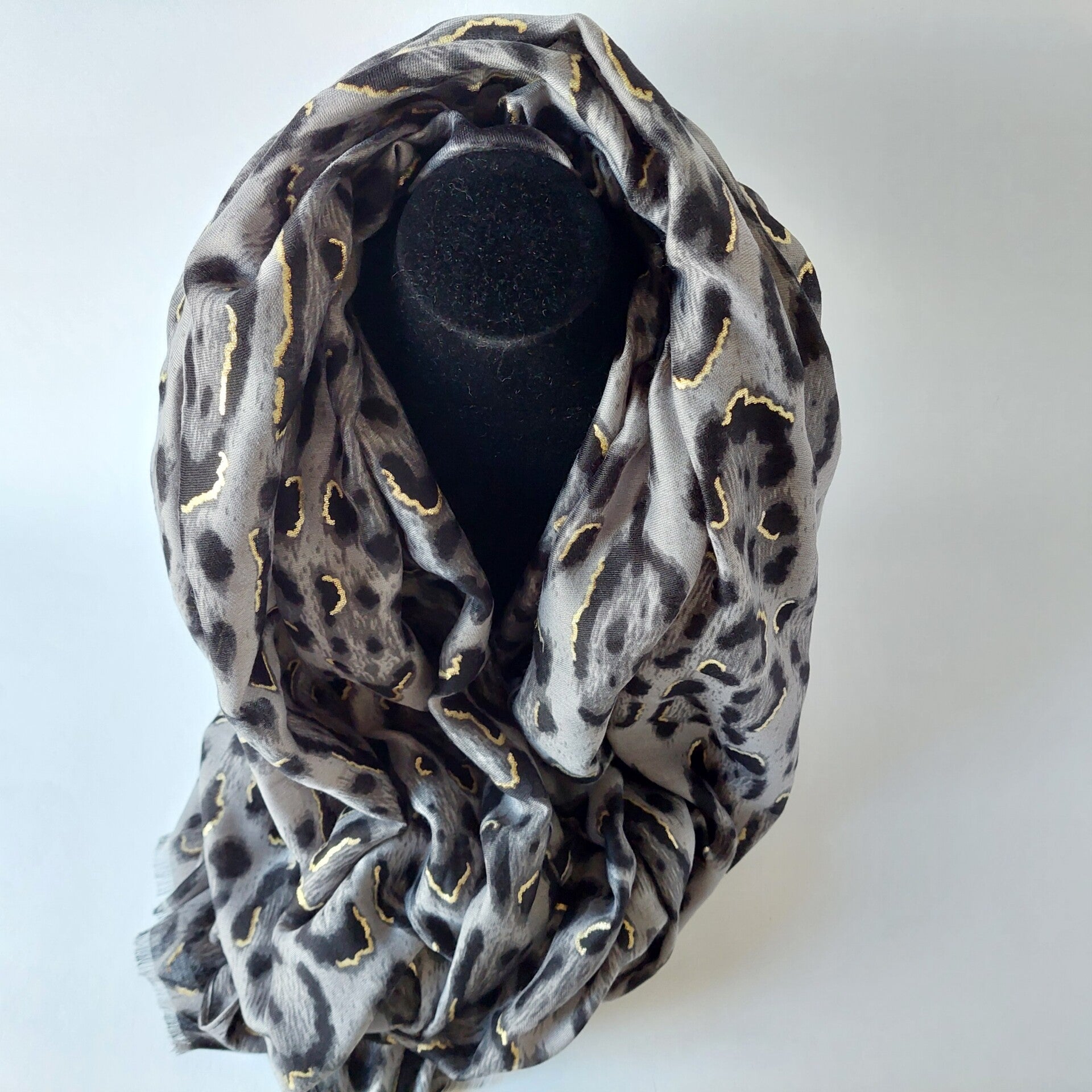 Elegante dames winter sjaal in crème, grijs en zwart met subtiel goud draad en speels wolkjes motief. Gemaakt van een fijne mix van viscose en katoen, licht maar warm en afgewerkt met stijlvolle franjes. Perfect om je winteroutfit een chique uitstraling te geven.