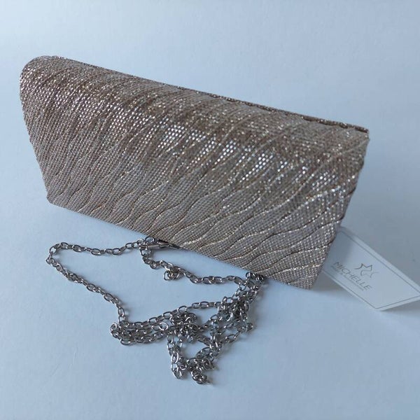 Chique dames clutch in champagne met glinsterende stof, magneetsluiting en zilverkleurige ketting. Perfect voor bruiloften, feestjes en speciale gelegenheden. Combineer stijl en gemak met deze elegante glitter clutch. Merk Michelle