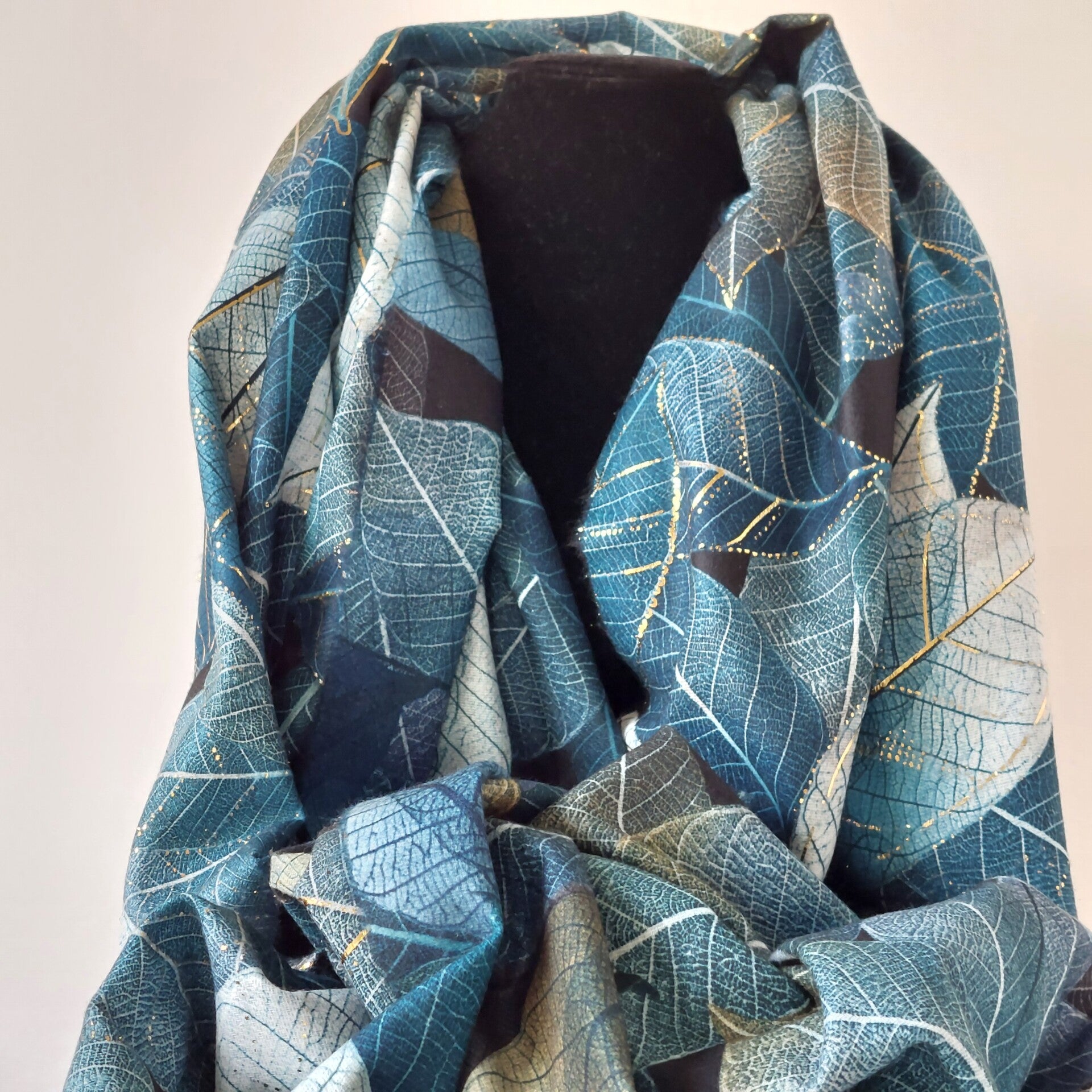 Blauwe Wintersjaal Dames – Luxe Sjaal met Bladmotief & Gouddraad – Super Zacht