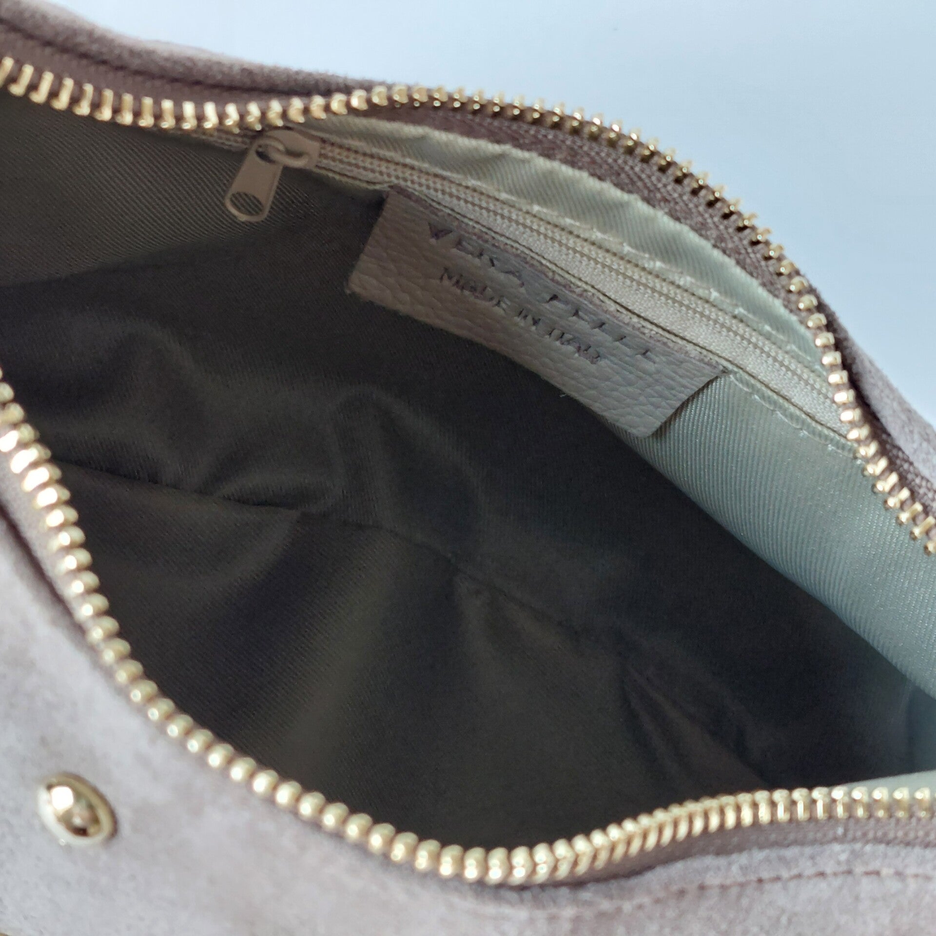 Beige schoudertas suède - leer handvat - gedraaid - ritssluiting - Italië - Vera Pelle - hand gemaakt - messing versierselen - losse band - opvallend mooi