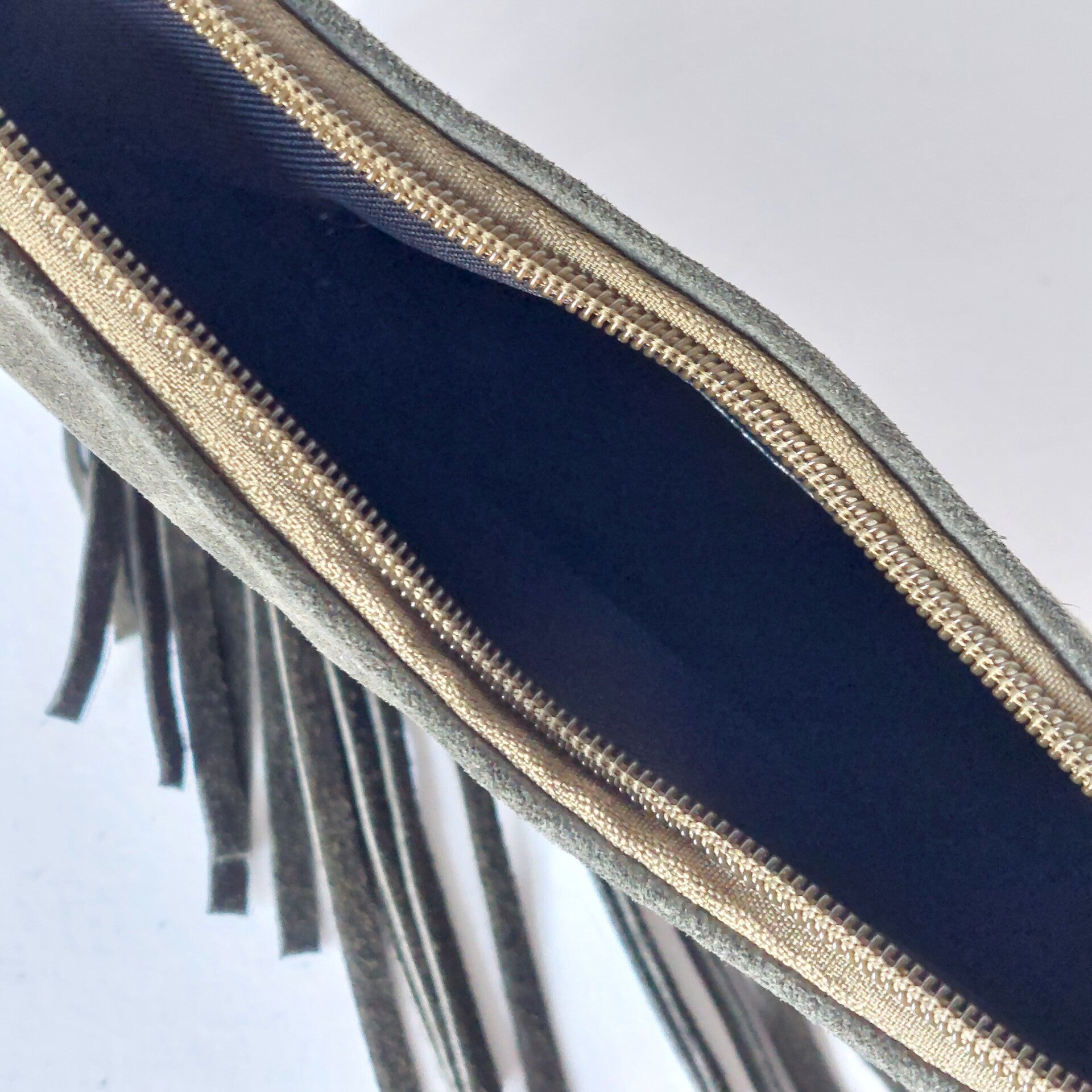 Vlotte groene suède crossbody tas met speelse franjes, verstelbare riem en veilige ritssluiting. Handgemaakt in Italië van zacht, hoogwaardig suède – stijlvol, praktisch en uniek.