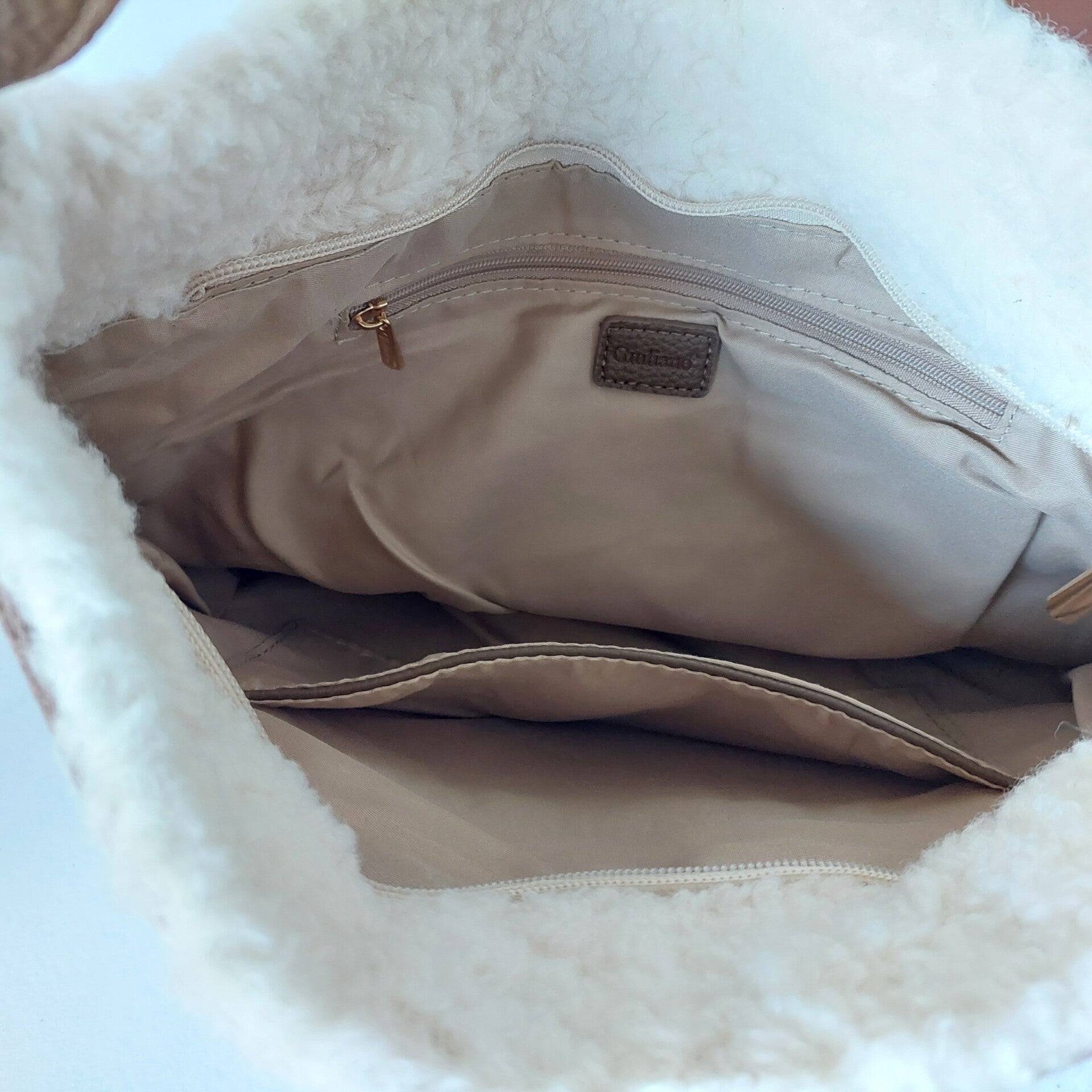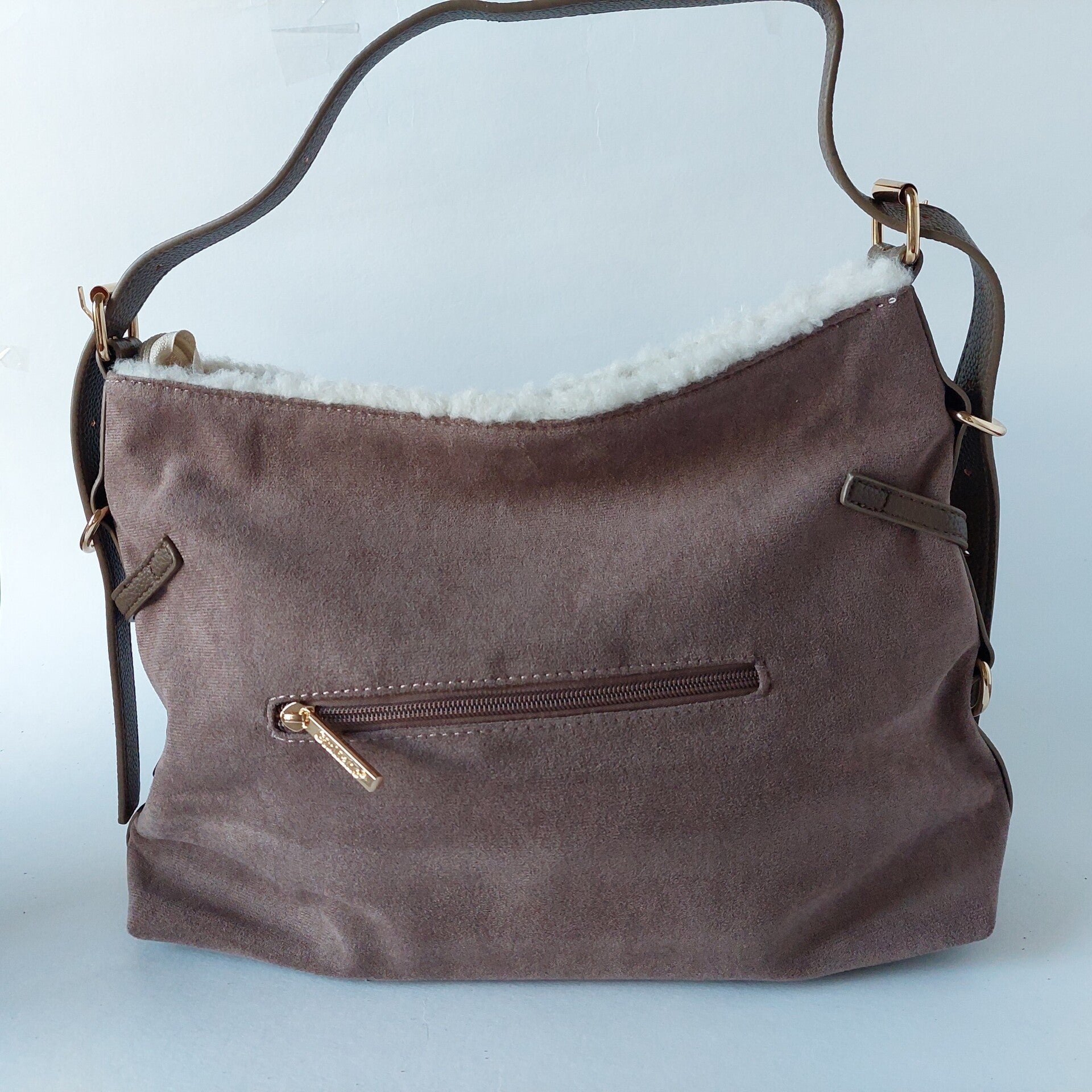 leuke Elegante taupe tas in suède look met zachte teddy rand aan de binnenzijde. Ruim model met verstelbare schouderband en sierriempjes aan de voorzijde. Een modieuze en praktische tas voor elke dag.