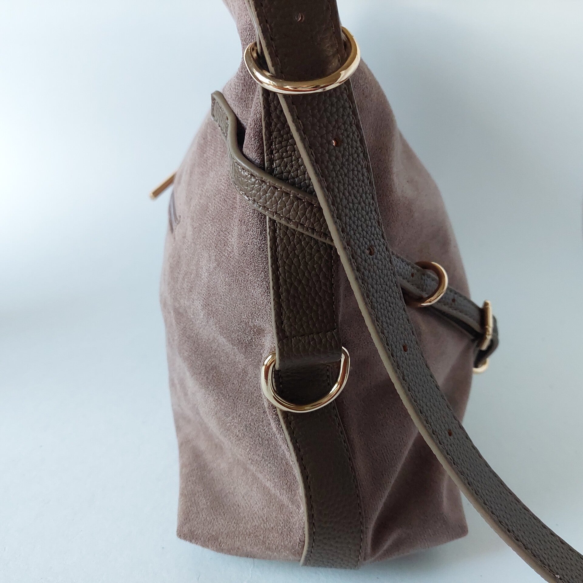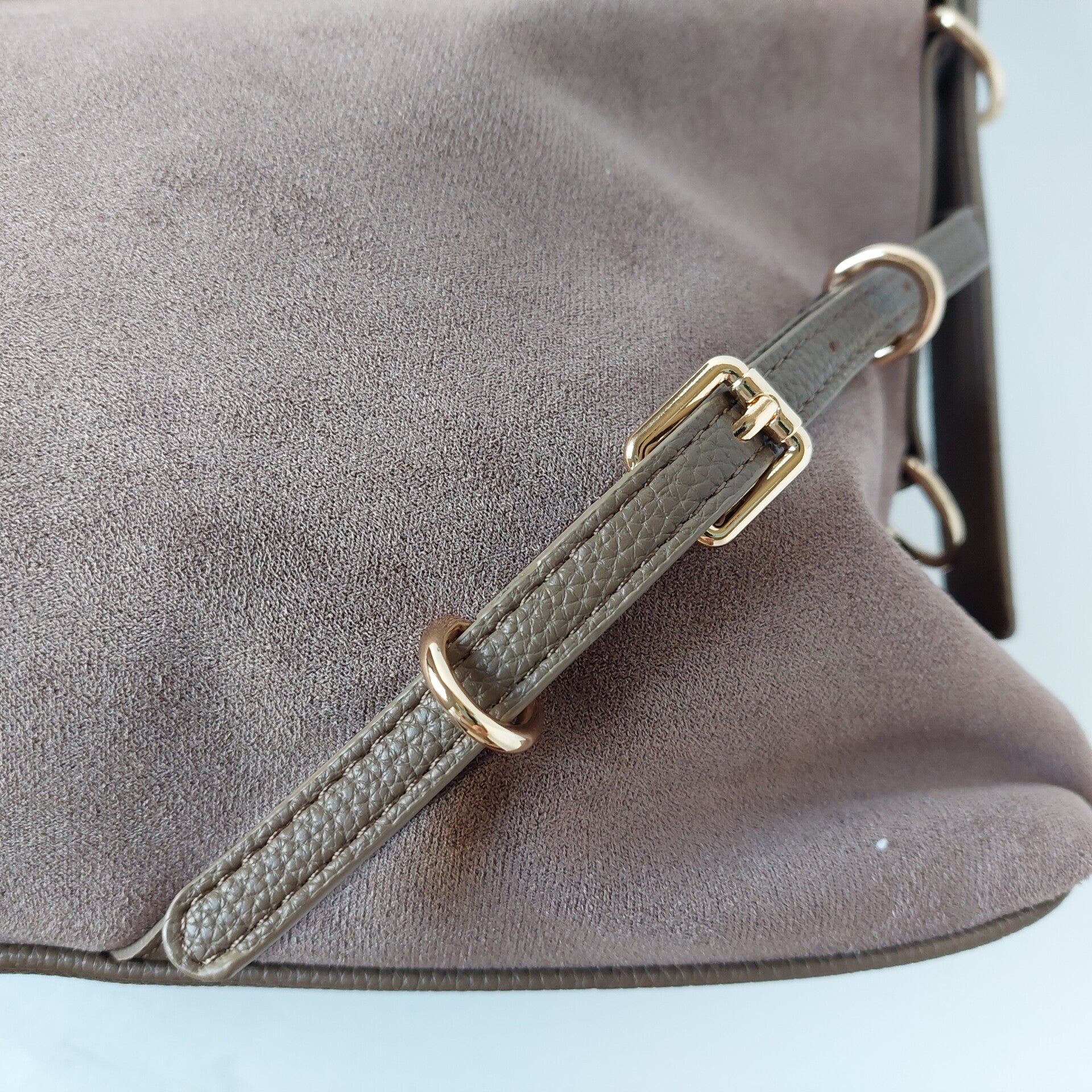 Taupe schouder hand tas - suède look - binnenzijde rand teddy stof - ruim - verstelbare schouderband - sierriempjes voorzijde