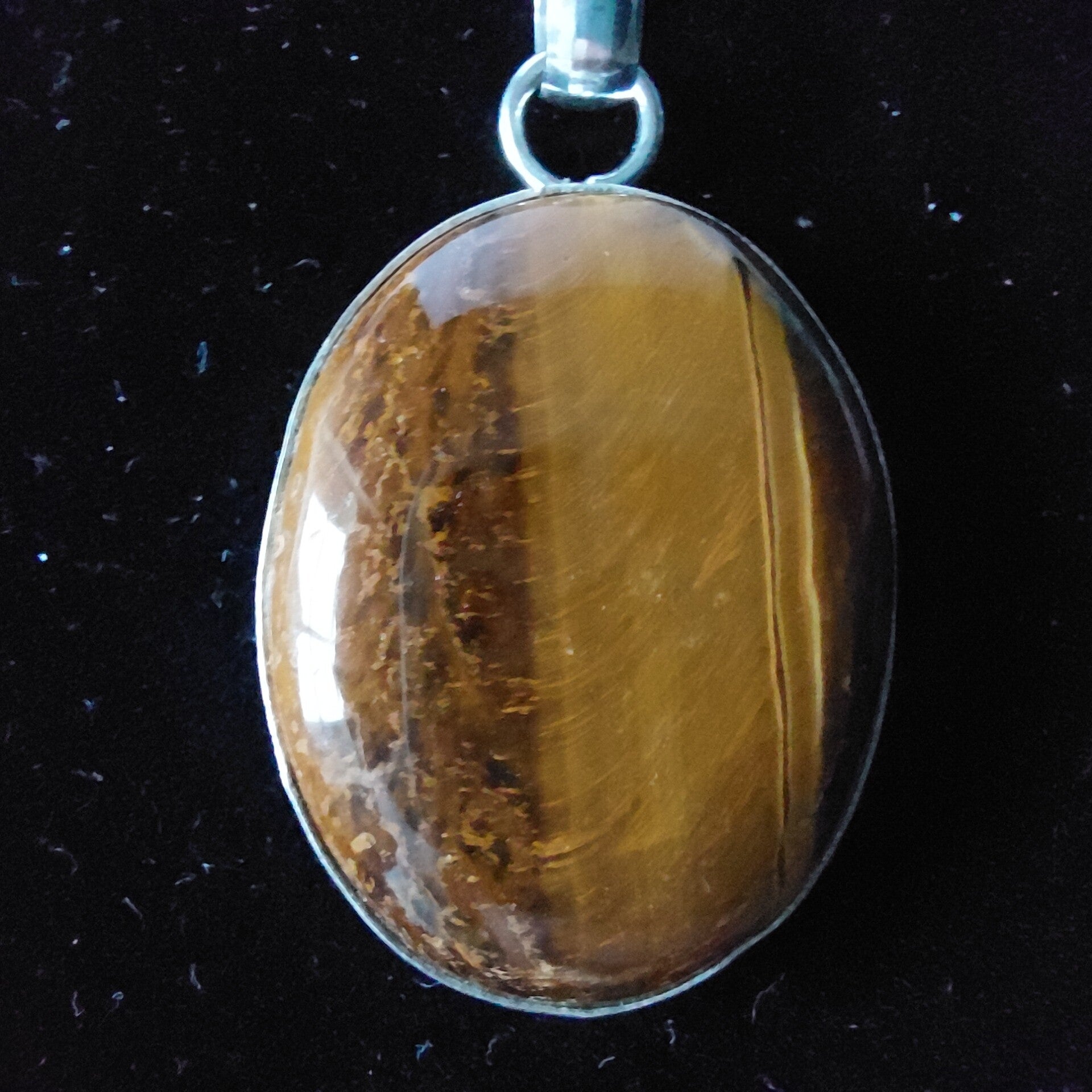handgemaakte hanger van tijgeroog edelsteen aan zilverkleurige ketting goudbruine kleur uniek sieraad