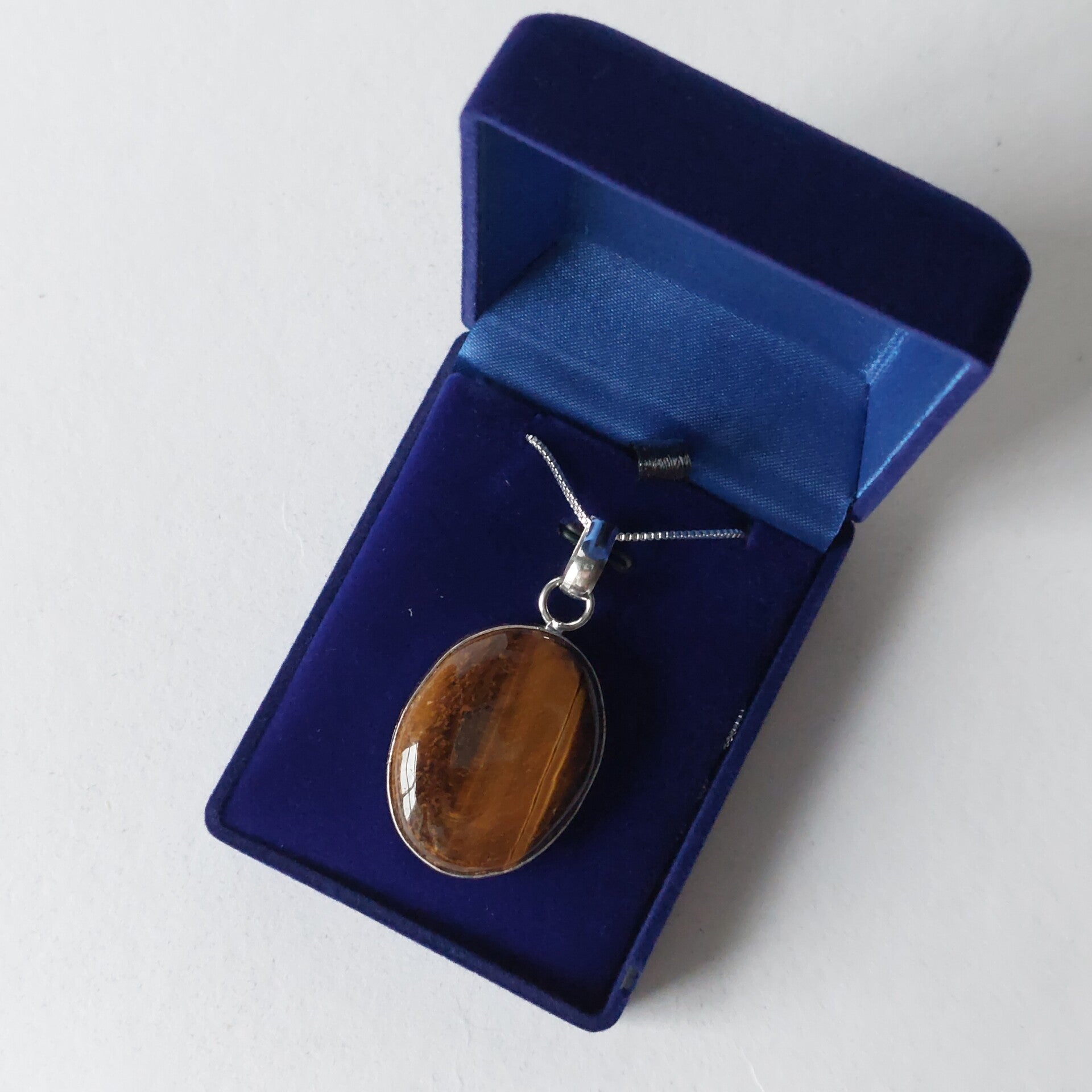prachtige handgemaakte hanger van tijgeroog edelsteen aan een zilverkleurige ketting. de tijgeroog heeft een warme goudbruine kleur met een natuurlijke glans die het licht op bijzondere wijze vangt. deze edelsteen staat bekend om zijn beschermende en aardende eigenschappen en wordt vaak geassocieerd met kracht en zelfvertrouwen. elke hanger is uniek door de natuurlijke tekening van de steen, waardoor je een bijzonder en tijdloos sieraad draagt. perfect als elegant accessoire of als betekenisvol cadeau voor liefhebbers van edelstenen en handgemaakte sieraden.
