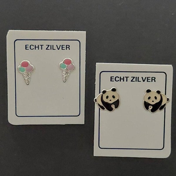 vrolijke zilveren baby- en kinder oorknopjes met ijsje en panda figuurtje. gemaakt van 925 sterling zilver, huidvriendelijk en van hoge kwaliteit. deze set van 2 paar wordt geleverd in een leuke geschenkverpakking – perfect als eerste oorbellen of als lief cadeautje voor een meisje. 🍦🐼✨