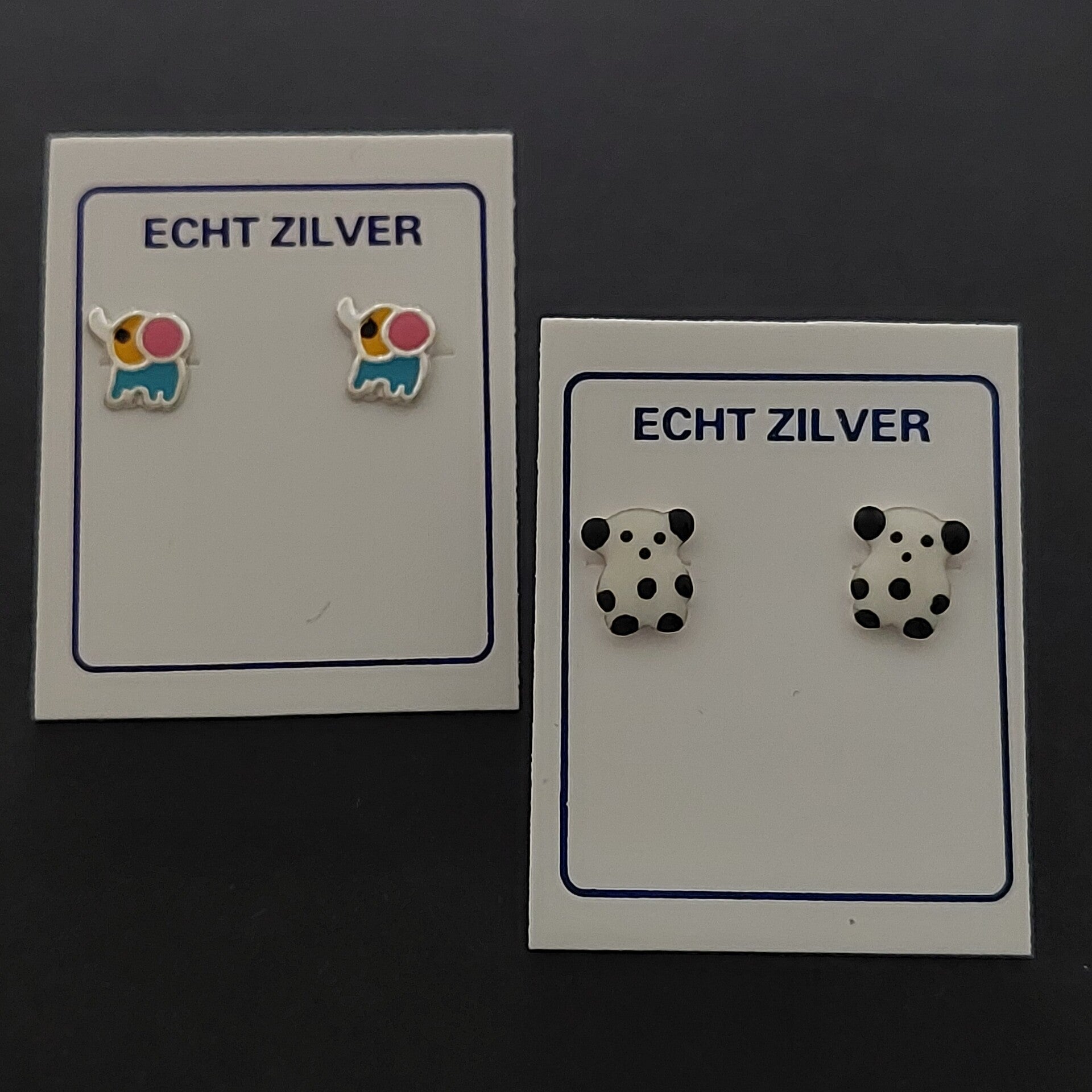 zilveren kinder oorknopjes witte pokemon en gekleurd olifantje – 925 sterling zilver baby oorbellen – 2 paar set – cadeau in geschenkverpakking