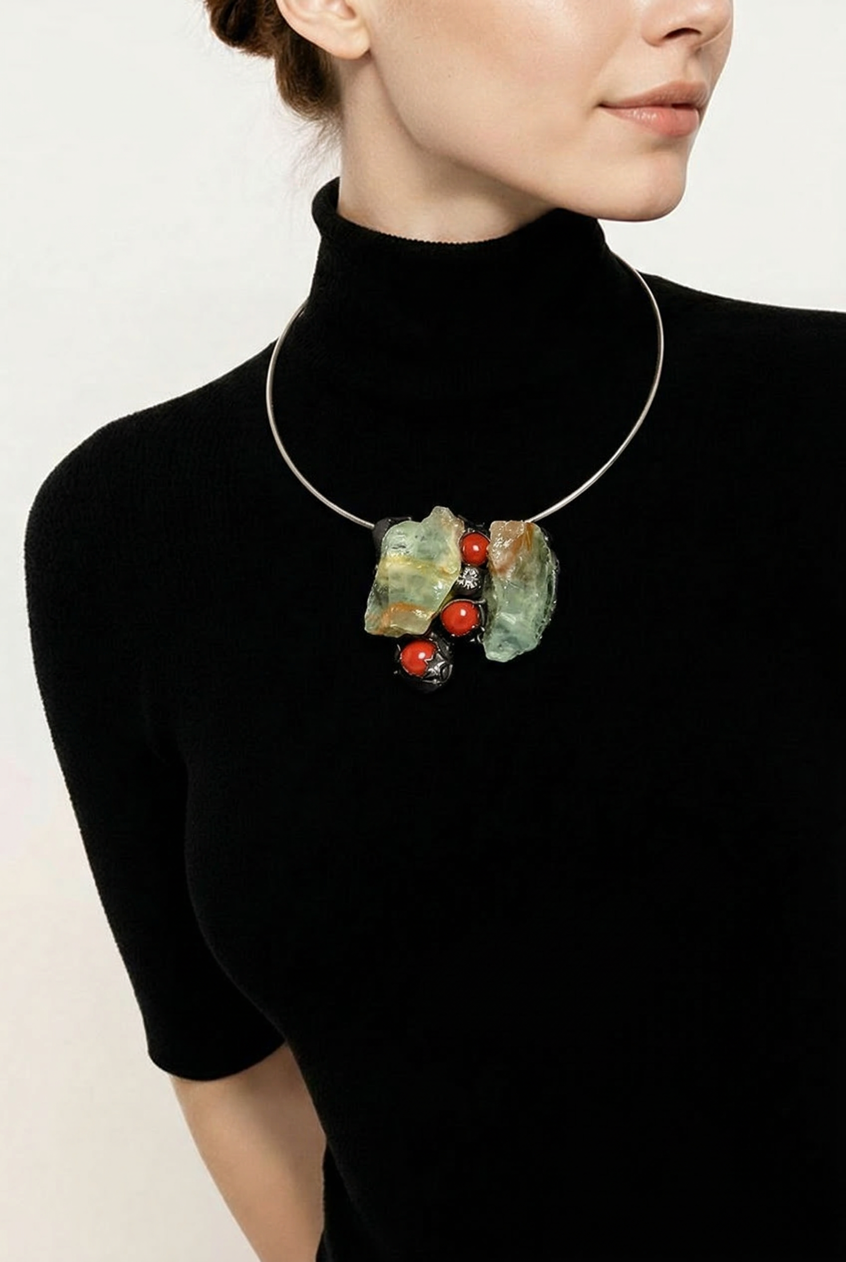 Uniek handgemaakt hals sieraad van epoxy, bezet met echte aquamarijn en verfijnd afgewerkt met rode bolletjes voor een speels contrast. Elk stuk is met zorg en liefde gemaakt en daardoor een echt unicaat. Kleine oneffenheden kunnen voorkomen en benadrukken het ambachtelijke karakter van dit bijzondere sieraad.