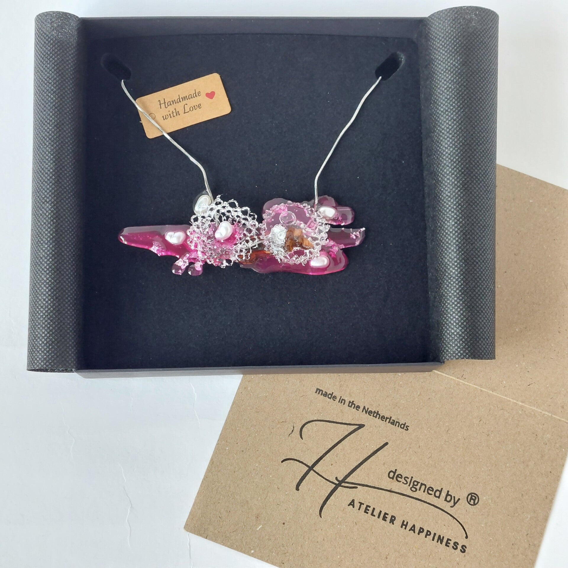Elegant handgemaakt hals sieraad in zachte roze tinten, met kleine pareltjes verwerkt in transparante rozetjes. De zilverkleurige ketting van 20 cm geeft het geheel een verfijnde en lichte uitstraling. Elk sieraad is met zorg gemaakt en daardoor uniek; kleine oneffenheden kunnen voorkomen en benadrukken het ambachtelijke karakter.