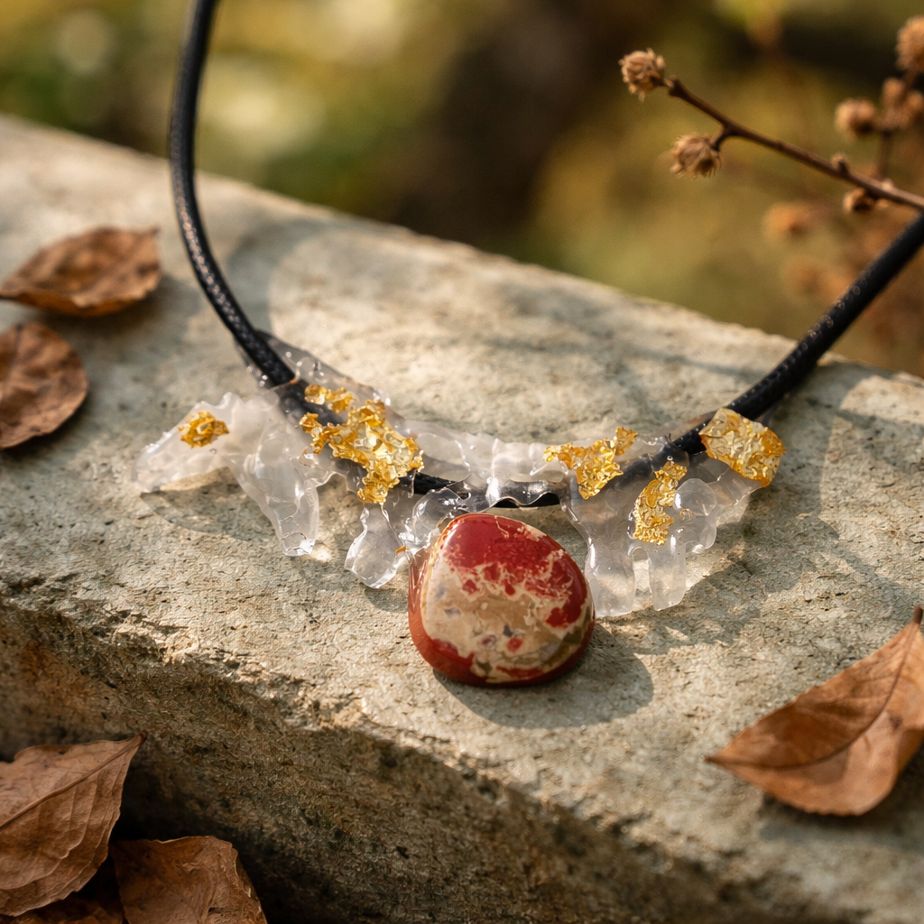Handgemaakt epoxy hals sieraad met een gepolijste rode jaspis, verfijnd afgewerkt met subtiel bladgoud voor een luxueus accent. Het sieraad hangt aan een zwart koord van 20 cm en is een uniek kunstwerk. Met liefde gemaakt; kleine oneffenheden kunnen voorkomen en benadrukken het ambachtelijke karakter van dit bijzondere sieraad.