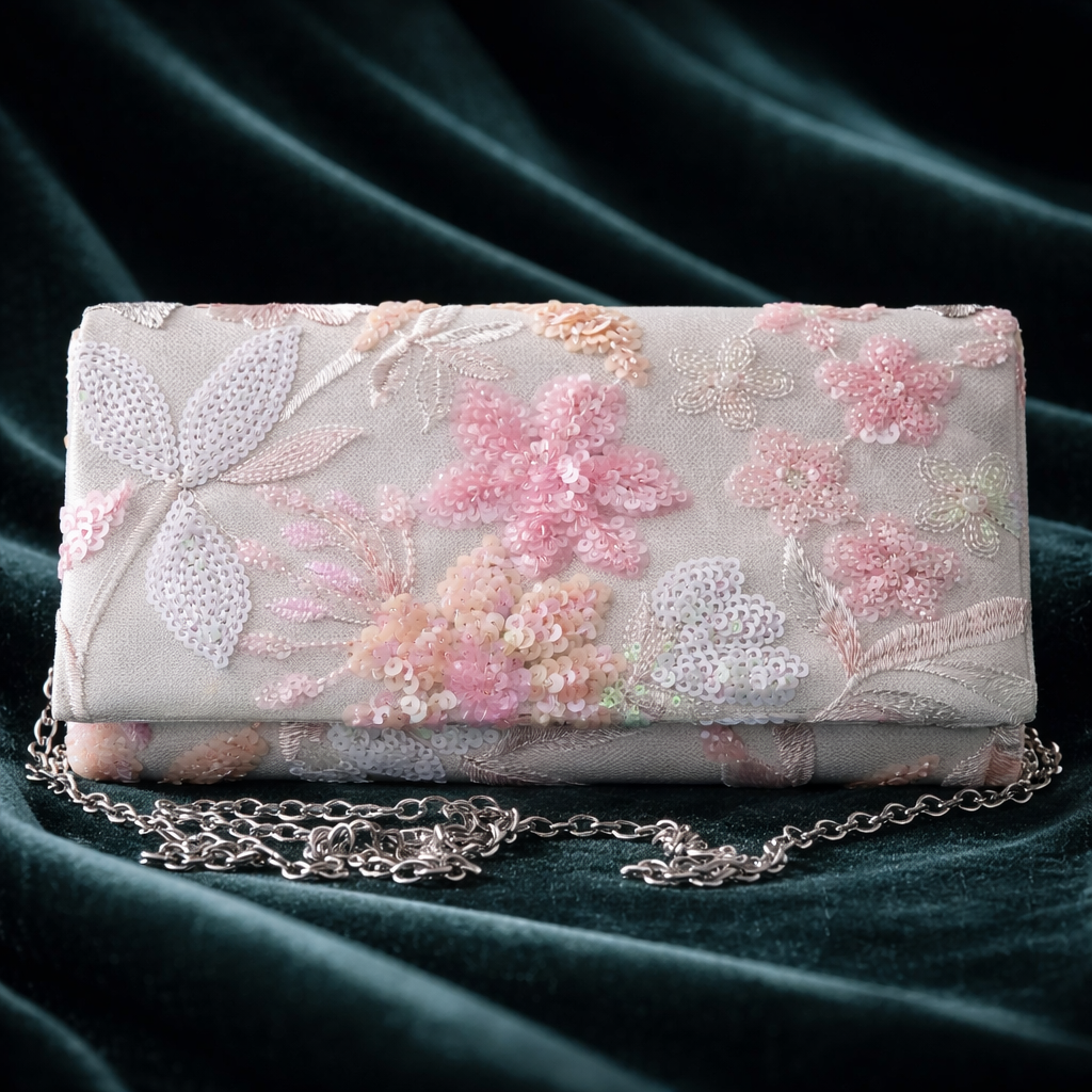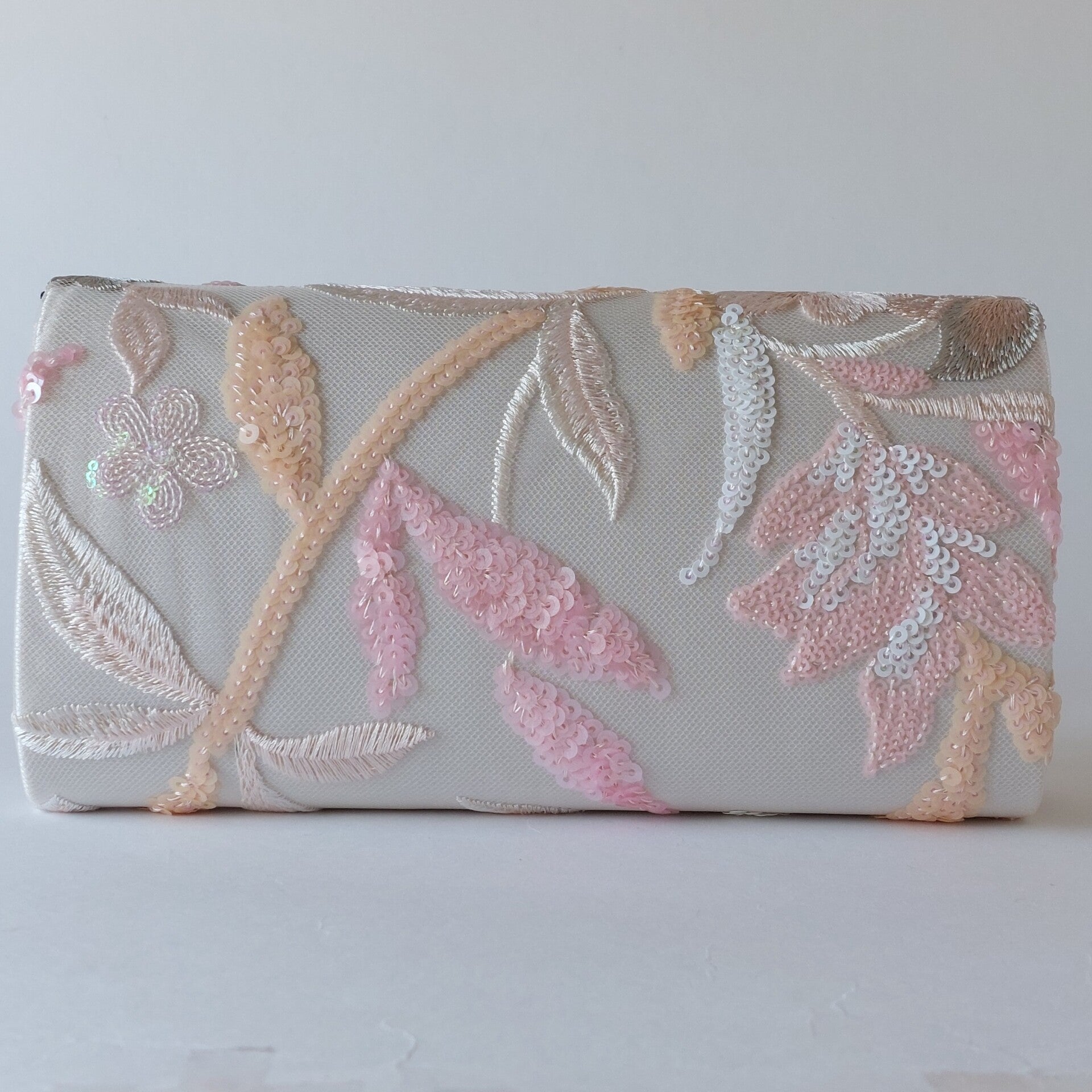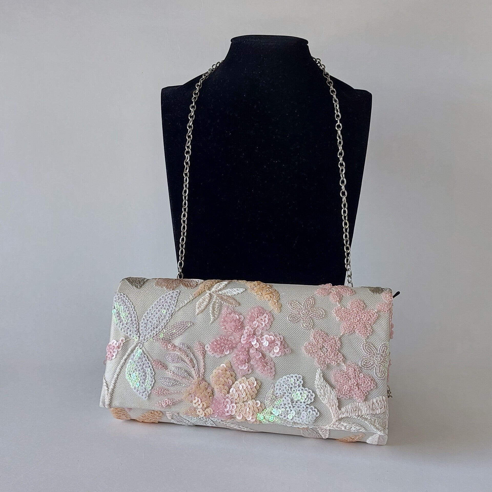 handgemaakte clutch in zachte pastelkleuren met een verfijnd bloemmotief afgewerkt met lovertjes en borduursel de tas heeft een luxe uitstraling en is een echte eye catcher voor feestelijke gelegenheden bruiloften en avonden uit licht elegant en uniek ontworpen voor dames die houden van een stijlvolle en bijzondere accessoire.