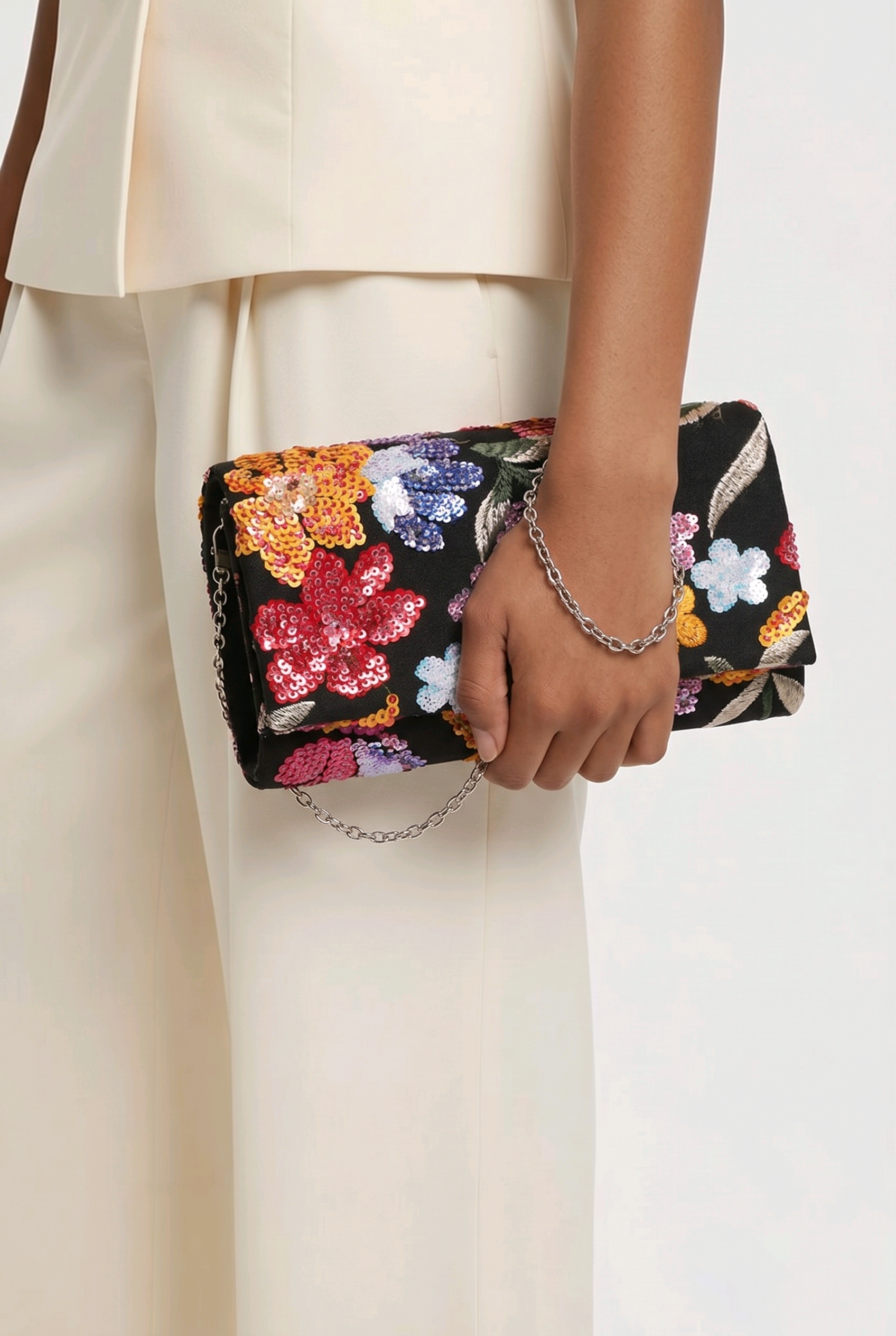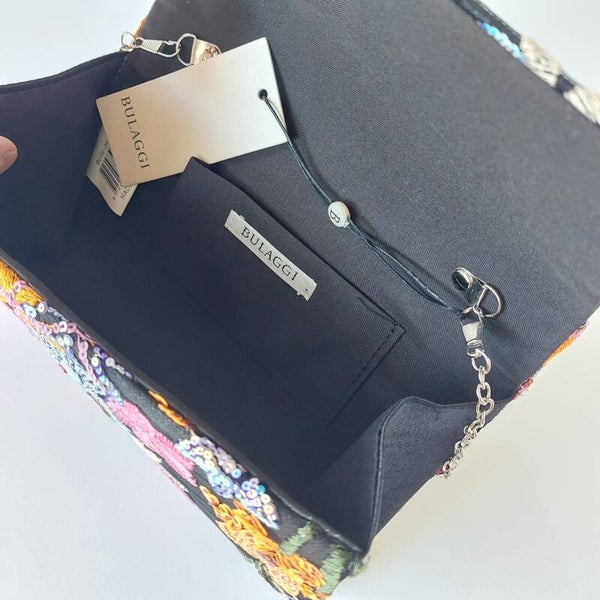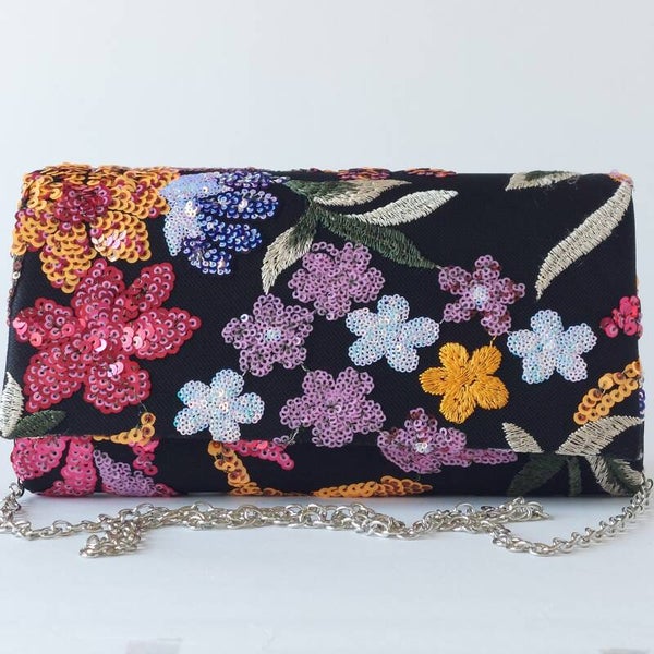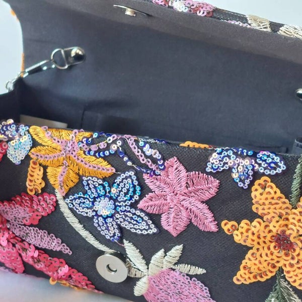 handgemaakte clutch met een opvallend bloemmotief afgewerkt met lovertjes en verfijnd borduursel deze unieke tas is een echte eye catcher en straalt luxe en vakmanschap uit door het gedetailleerde ontwerp en de rijke afwerking is elke clutch net even anders en exclusief verkrijgbaar in beperkte oplage perfect voor feestelijke gelegenheden bruiloften en avonden uit een bijzondere accessoire voor wie echt wil opvallen.